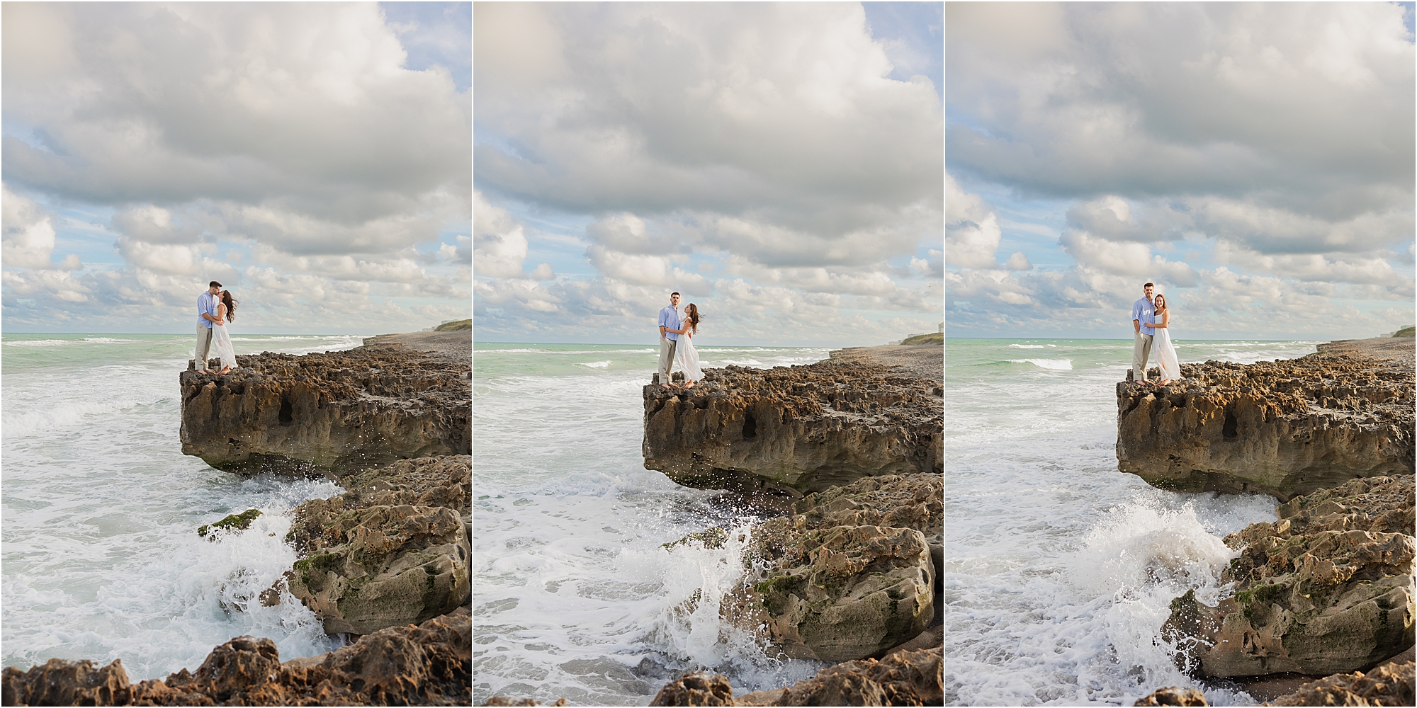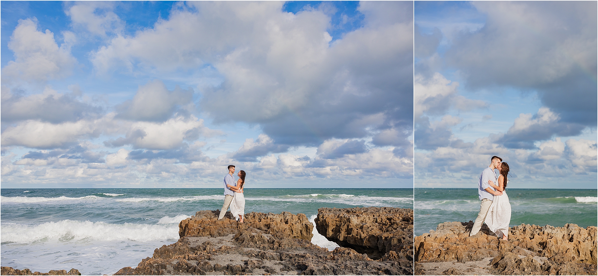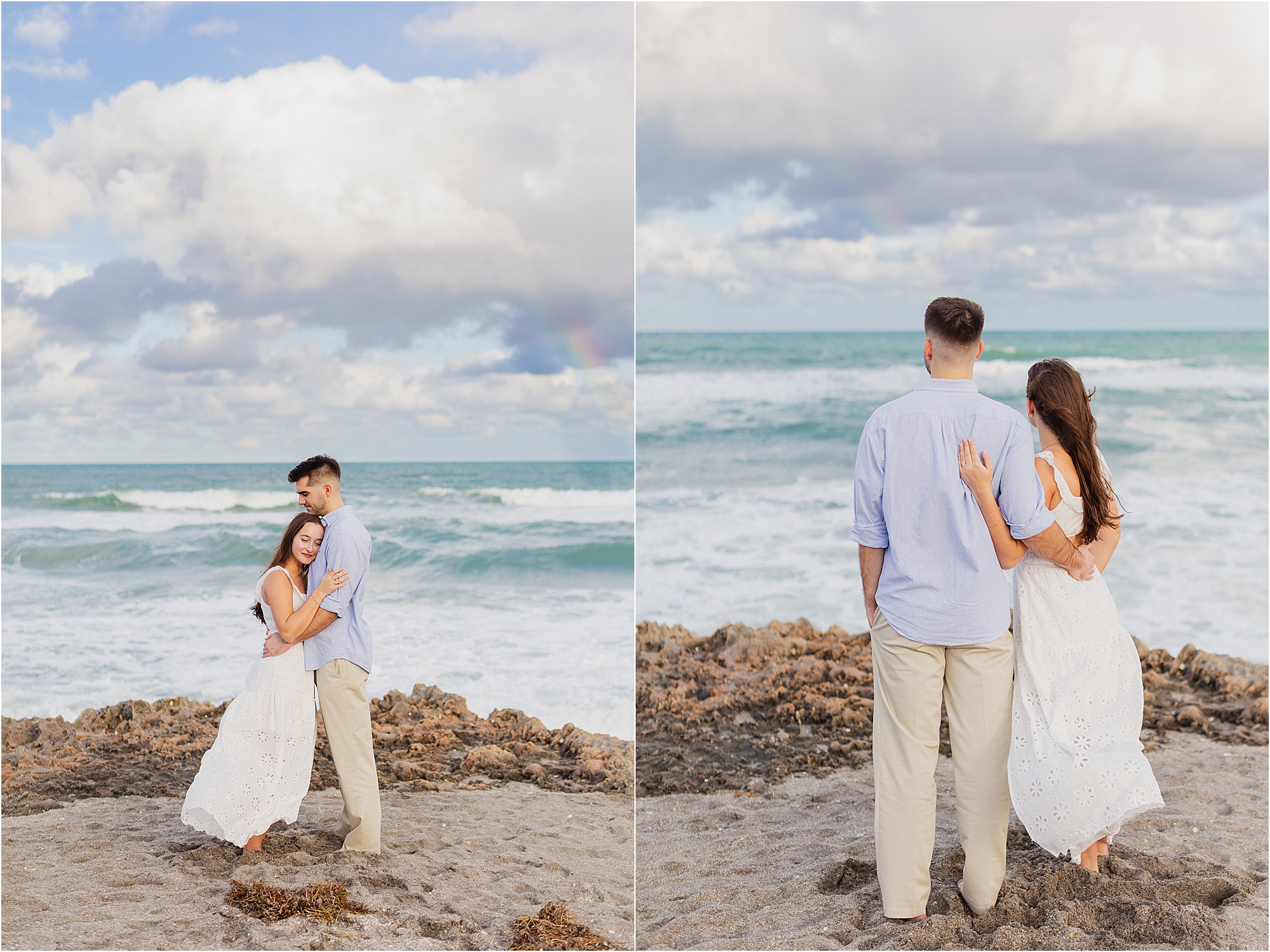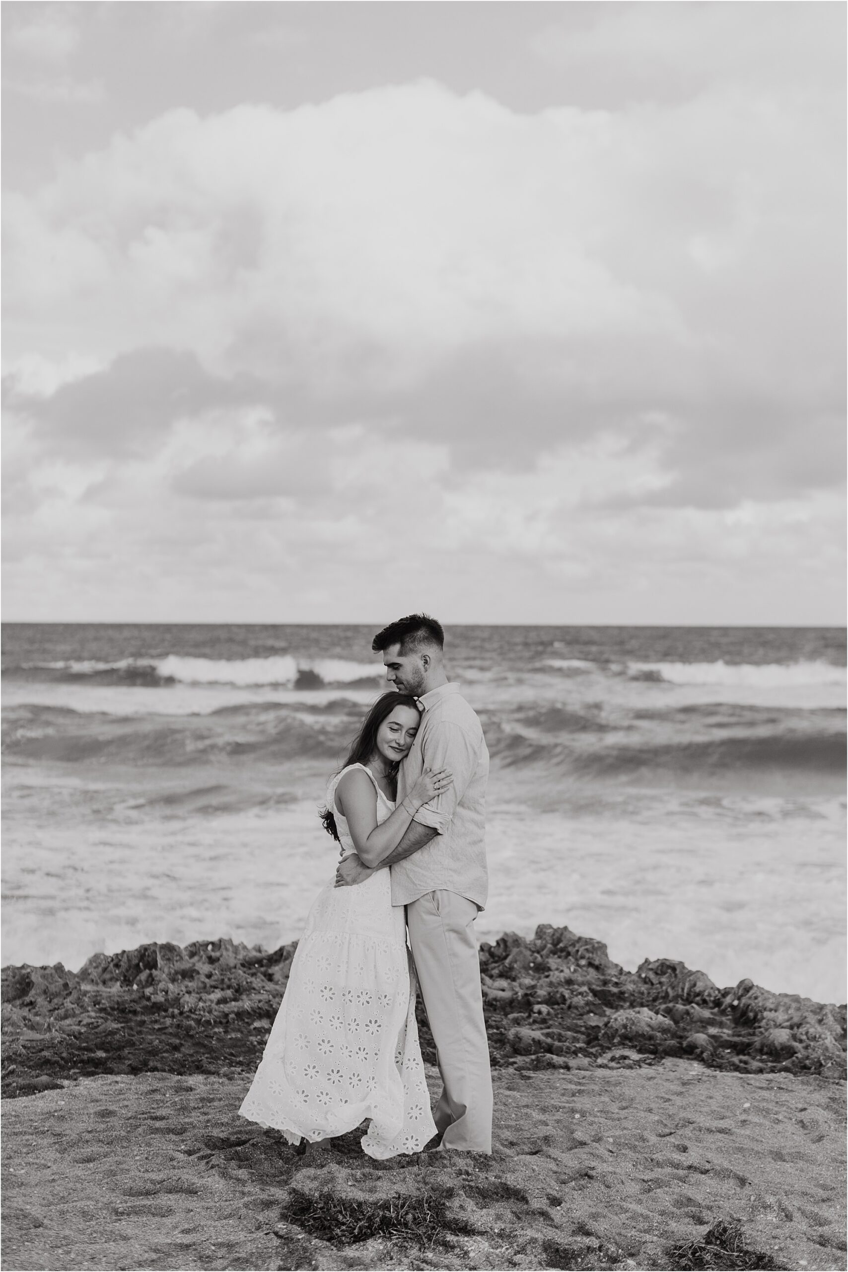 After capturing part of their session near the Jupiter Lighthouse, we transitioned to the nearby beach for a completely different feel. Where the lighthouse offered structure and history, the beach brought movement, openness, and a more organic sense of romance. This contrast allowed the gallery to feel dynamic while still cohesive.