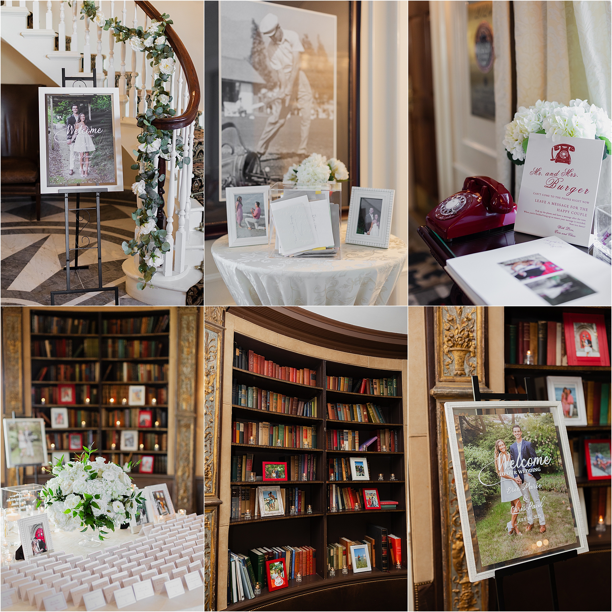 Erin carried family with her down the aisle in meaningful ways—borrowing the crown her sister wore on her own wedding day and wearing pearl jewelry gifted by her mother. A display of wedding photos from parents and grandparents honored the love stories that came before theirs, grounding the day in tradition and legacy.
