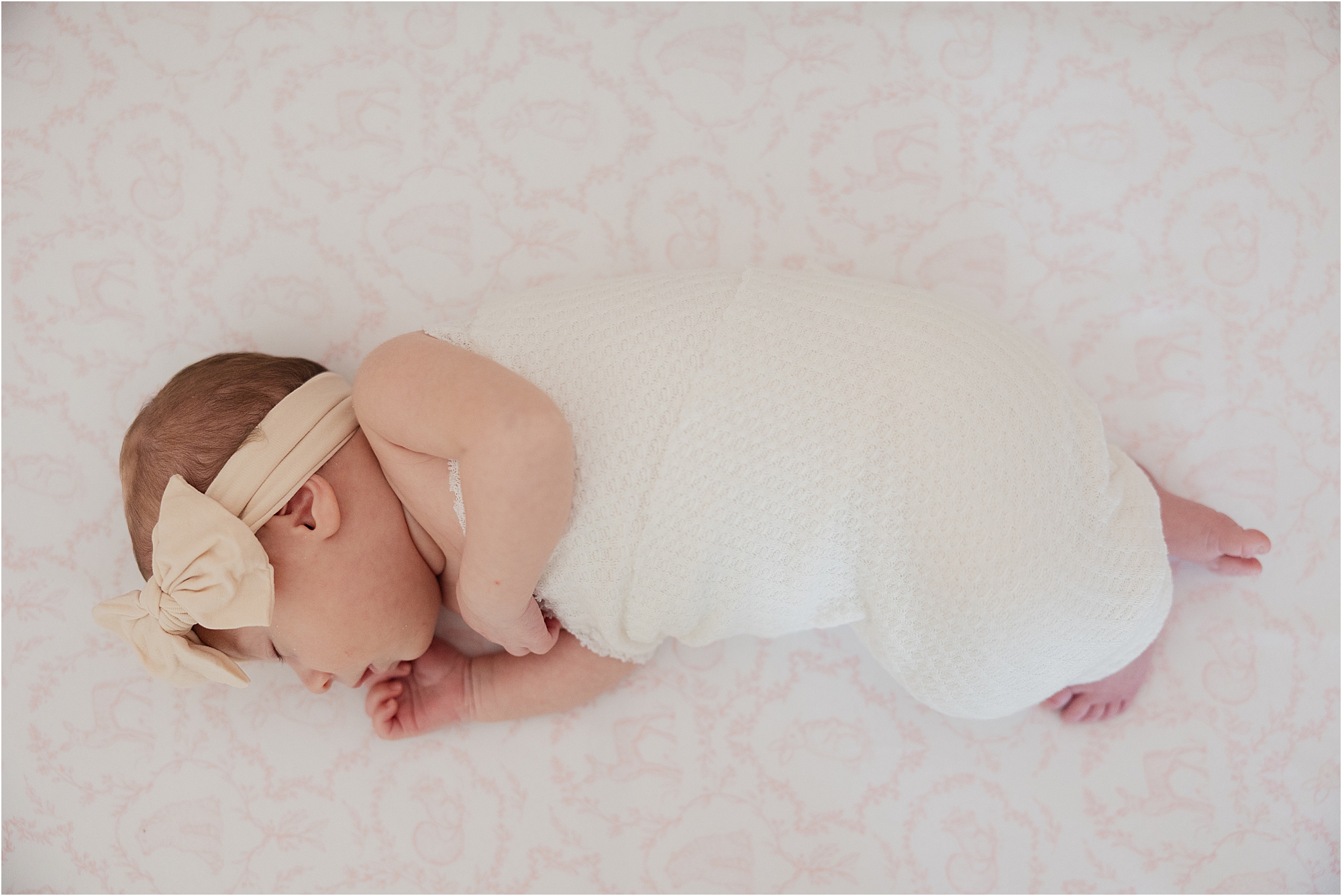Newborn sessions are typically photographed within the first two to three weeks after a baby is born. During this time babies tend to be sleepier and curl naturally into those cozy newborn poses.